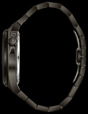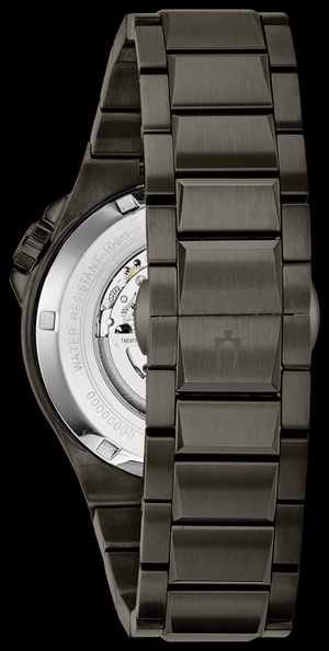 De la collection automatique. Nouveau style sport dans un boîtier en acier inoxydable gunmetal IP, un cadran noir à ouverture ouverte avec des accents argentés et un anneau de cadran intérieur noir, un fond d'exposition, un mouvement automatique squelette avec une réserve de marche de 40 heures, un verre saphir, un bracelet en acier inoxydable gunmetal IP avec une double pression fermeture de déploiement, et résistance à l'eau à 100 mètres.