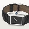 Montre Tank Must, grand modèle, mouvement à quartz. Boîte en acier, couronne perlée ornée d'un spinelle de synthèse en forme de cabochon, cadran laque noire, aiguilles en forme de glaive en acier rhodié, bracelet en alligator semi-mat noir, boucle ardillon en acier. Taille de la boîte : 33,7 x 25,5 mm, épaisseur : 6,6 mm. Etanche jusqu'à 3 bar (~30 mètres).
