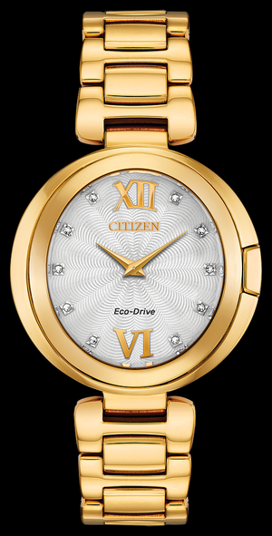CITIZEN® atteint un nouveau standard moderne avec sa collection Capella. Courbes élégantes, esthétique ininterrompue et expertise technique sont toutes mises en valeur par les montres originales de cette collection. Modèle à diamant montré avec un boîtier et un bracelet en acier inoxydable aux teintes or et un cadran argenté à couronne intégrée, l’ensemble créant une structure harmonieuse. Doté de la technologie Eco-Drive de CITIZEN et alimenté par la lumière, sous toutes ses formes. N’a jamais besoin de pile.