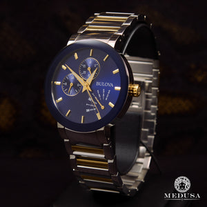 From the modern collection. Stainless steel with silver and gold finishes, blue dial, domed mineral glass, six multifunction movement, and deployment clasp.