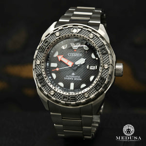 Dive into a new collection of automatic dive watches with a deep connection to Citizen's history of innovation and exclusive technology. The new Promaster Automatic Diver 200M watch features Citizen Super Titanium™ construction that is both lightweight and ultra-durable. The bezel has angled tabs for an easy grip, and the bezel and dial feature a pyramid stud design surrounding a double-domed anti-reflective sapphire crystal, with the black dial contrasting nicely with the titanium case and bracelet for a strong aesthetic of sport, style, and performance. Powered by the movement of your wrist, this advanced automatic watch has a 42-hour power reserve and large luminous hands and markers applied to provide easy reading in the dark or underwater. It comes in an exclusive collector’s tank box and meets ISO standards with a screw-down crown and water resistance up to 200 meters. Caliber 9051.