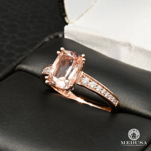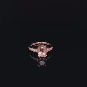 Morganite ring with French Cut diamonds. This incredible diamond-studded ring is set on a 14K rose gold band.