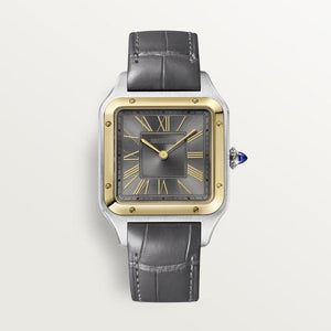 Santos-Dumont watch, large model, quartz movement. Steel case, bezel in Yellow Gold 750/1000, beaded crown adorned with a synthetic blue spinel cabochon, sun satin gray dial, gold Roman numerals, polished gold-tone sword-shaped steel hands, sapphire crystal, gray alligator strap, steel pin buckle. Case size: 43.5 x 31.4 mm, thickness: 7.3 mm. Water-resistant up to 3 bars (~30 meters).