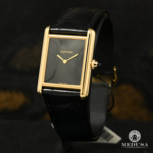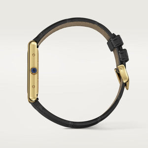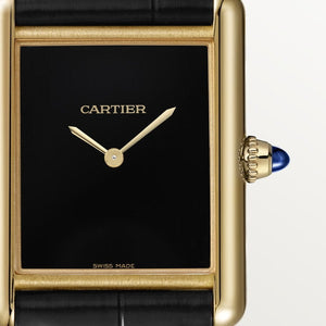 Tank Louis Cartier watch, large model, manual winding mechanical Manufacture movement. Case in Yellow Gold 750/1000, beaded crown set with a sapphire, black lacquer dial, sword-shaped hands in gold-finished steel, mineral glass, semi-matte black alligator strap, pin buckle in Yellow Gold 750/1000. Case size: 33.7 mm x 25.5 mm, thickness: 6.6 mm. Water-resistant up to 30 meters.