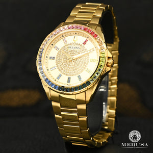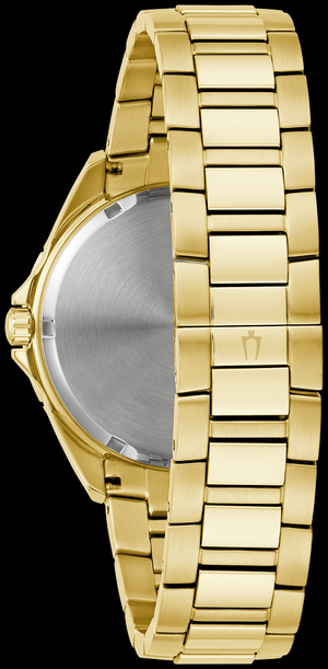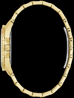 For the bold and daring in spirit and style, Bulova presents the opulent and adorned Phantom men's watch from the Crystal collection. The stunning gold-tone stainless steel case is set with a rainbow of colored crystals around the bezel that sparkle in the light. The champagne dial features gold-tone hands and adds even more glamour, with crystal-set indices matching the bezel and a richly textured gold crystal pavé shadow in the center. A matching gold-tone stainless steel bracelet offers a deployment clasp. For the extravagant days of life, the new Bulova Phantom men's watch from the Crystal collection is here to make a statement.