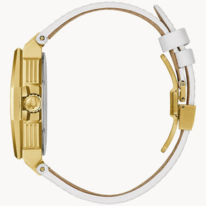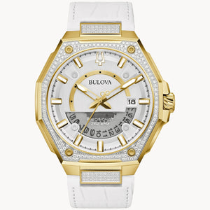 This stunning new Precisionist X Diamond men's watch is sure to make a lasting impression. The masculine architectural design of this remarkable watch is accented with 174 hand-set diamonds totaling 0.83 ct, hand-set on a gold and silver stainless steel case. The silver-white 3-hand calendar dial is detailed with a display calendar window and finished with a curved sapphire crystal, offering a sophisticated and polished effect. The look is completed by a white leather strap with a deployant clasp with pushers for easy release. This luxury watch is water-resistant up to 100 meters and is powered by Bulova's exclusive high-performance 262 kHz 3-hand calendar movement. Take bold style to the next level with this innovative watch, combining design and technology.