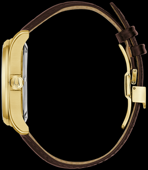 Timeless elegance is effortlessly combined with advanced GMT functionality in the new luxurious Wilton Automatic watch from the Bulova Classic collection. This traditionally styled watch features a new innovative automatic movement with the ability to easily set the hour hand to another time zone without affecting accuracy when traveling anywhere in the world – and the dual time can be read at a glance. The sophisticated design of the gold-tone stainless steel case presents a bright silver-white 4-hand GMT dial with a calendar, Roman numeral indexes, and a domed anti-reflective sapphire crystal. The luminous tip of the GMT hand is edged in a tone matching the "GMT" printed on the dial and works with the bi-color 24-hour dial ring to mark the 2nd time zone. The dial features a world map with the land area embossed in a CD groove texture with latitude and longitude coordinates also embossed above the sea. The brown embossed alligator leather strap with tone-on-tone stitching, a nubuck lining, and a double-press deployant buckle completes the richly elegant atmosphere. The 24-jewel automatic movement of this watch guarantees optimal performance and has a 42-hour power reserve, making it the ultimate watch for world travelers and high watchmaking enthusiasts. Water resistant up to 30 meters.