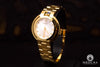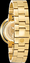 From the Rubaiyat collection. Legendary heritage reinvented in a gold-tone stainless steel case with a synthetic blue spinel cabochon crown positioned at 12 o'clock and eight individually hand-set diamonds on a textured silver-white dial, a double domed sapphire crystal, a gold-tone stainless steel bracelet with double push-button deployment clasp, iconic Goddess of Time embossed dimensional back, and water resistance up to 30 meters.