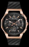 From the CURV collection. The world's first curved chronograph movement features an exclusive high-performance quartz technology with a vibration frequency of 262 kHz for precise accuracy. Five-hand chronograph with rose gold-tone stainless steel case and black bezel, exhibition case back, black dial with rose gold-tone hands and indices, curved anti-reflective sapphire crystal, screw-down case, black EPDM rubber strap with three-hand movement. Piece buckle closure and water resistance up to 30 meters.