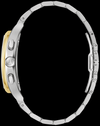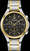 Combining unparalleled finesse with Bulova’s cutting-edge technology, this new 5-hand men's watch from Bulova redefines the avant-garde CURV collection. Equipped with the world's first curved movement, the watches in the CURV collection use a high-performance 262 kHz quartz technology, offering remarkable accuracy of 5 seconds per month. This new CURV model stands out with its silver and gold-tone stainless steel case enhanced by polished and brushed accents, topped with a curved sapphire crystal. Skeletonized, the elegant black striped dial offers a glimpse of the complex movement. Featuring stainless steel markers in gold tones and hands that contrast with the background, the dial includes three subdials displaying elapsed time in 12-hour, 60-minute, and 60-second intervals. The subdial at the 6 o'clock position serves as a 60-second chronograph and running seconds hand. The pusher located at the 4 o'clock position activates the dual time zone display. Fitted with a matching silver stainless steel bracelet with gold tones, this watch fastens with a deployant clasp with push buttons. Redefining the refined profile of the first model in the CURV collection, this new Bulova watch embodies elegance and sophistication, making it perfect for any occasion.