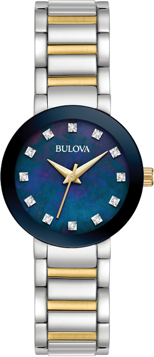 From the Futuro collection. In stainless steel and gold-tone, 12 diamonds, individually hand-set on a blue mother-of-pearl dial, a domed mineral glass, an edge-to-edge metallic crystal, a stainless steel and rose gold-tone bracelet with a deployment clasp.
