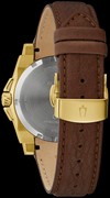 Bulova presents a new addition to its Icon collection for elegantly adventurous men, continuing the line's commitment to exceptional precision and remarkable design. The spectacular 40 mm gold case is Made in 316L stainless steel for greater durability and is equipped with a curved sapphire glass. The watch features a multi-level black dial with luminescent gold hands and markers and a date display. Watches in the Icon collection are powered by Bulova's Precisionist movement, a revolutionary 8-jewel quartz mechanism vibrating at a remarkable frequency of 262 kHz, accurate to 5 seconds per month with increased resistance to temperature changes and a fast second hand. The watch offers 100 m water resistance and is paired with a luxurious brown racing-style leather strap that meets the case for a harmonious silhouette. Bold without shame and unmatched in precision, this new men's Bulova watch from the Icon collection is an ideal way to make a statement.