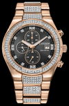 Bring sophistication to your day with the CITIZEN® Crystal. This timeless chronograph watch displays 12/24 hour time and is presented in a rose gold-tone stainless steel case and bracelet adorned with crystals with a black dial. Equipped with our Eco-Drive technology – powered by light, any light. Never needs a battery.