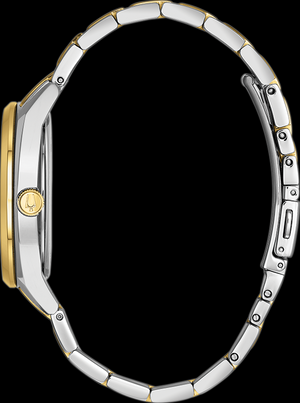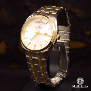 Two-tone gold stainless steel case with new day/date function, three hands, silver white dial with gold hands and indexes, domed mineral glass, and gold and stainless steel bracelet with double push-button clasp.