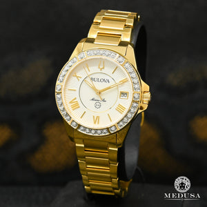 From the Marine Star Collection. New Marine Star in a gold stainless steel case with 29 diamonds, individually set on a bezel and a gold-accented dial, white mother-of-pearl inner dial, sapphire glass, screw-down case, stainless steel bracelet with deployment clasp, and water resistance up to 100 meters.