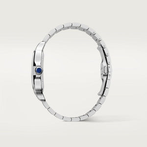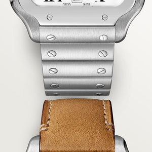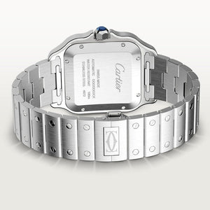 Santos watch, large model, mechanical movement with automatic winding 1847 MC. Steel case, 7-sided crown adorned with a faceted synthetic spinel, silver opaline dial, sword-shaped blued steel hands, sapphire crystal. Steel bracelet with "SmartLink" sizing system. Second calfskin strap, with interchangeable steel deployant buckle. Both straps are equipped with the "QuickSwitch" interchangeability system. Case width: 39.8 mm, thickness: 9.08 mm. Water resistant up to 10 bars (~100 meters).