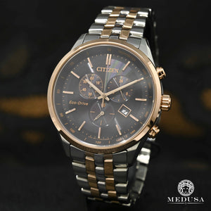 CITIZEN® adds a touch of sophistication to your watch collection with this dress chronograph featuring a sapphire crystal. This beautiful watch is presented in two-tone gold stainless steel with a black dial. Additional features include a one-second chronograph measuring up to 60 minutes, a 12/24 hour time display, and a date. Water resistant up to 100 meters.