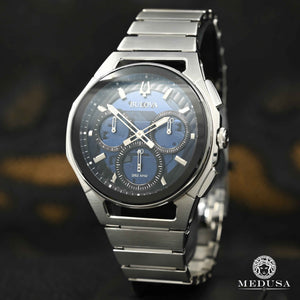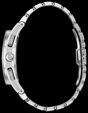 From the CURV collection. The world's first curved chronograph movement features high-performance quartz technology with a vibration frequency of 262 kHz for precise accuracy. Five-hand stainless steel chronograph with dark blue dial with silver hands and indices, exhibition case back, curved anti-reflective sapphire crystal, screw-down case, stainless steel bracelet with double-press deployant clasp, and water resistance up to 30 meters. Elegance and sophistication, making it perfect for any occasion.