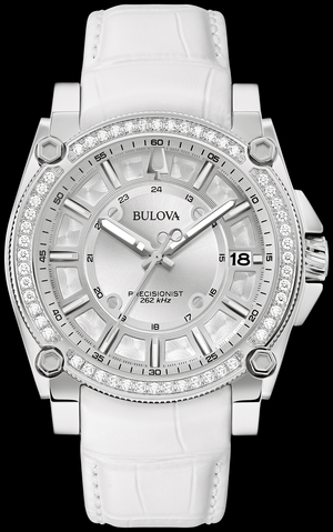 From the Icon collection, this watch is an astonishing interpretation of modern design, powered by Bulova's most advanced Precisionist movement technology. Featuring angular lines and pronounced facets, the 40mm silver stainless steel case is adorned with a hand-set bezel of 52 dazzling full-cut 1.5mm diamonds totaling 0.79 ct. The case is equipped with a curved sapphire crystal and is water-resistant to 100m. A radiant silver dial presents a grooved texture and is segmented by applied silver indices, with silver hands filled with luminescent material. The large seconds hand features the signature "P" counterweight, denoting the Bulova Precisionist movement powering the watch. The Precisionist movement is a revolutionary 8-jewel quartz mechanism accurate to 5 seconds per month and offering enhanced resistance to temperature changes. The design is completed by a white crocodile-grain leather strap with a push-button deployant clasp. Embrace a new level of elegance with this stunning watch from the Bulova Icon collection.