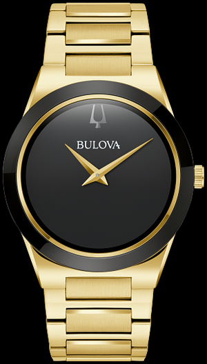 This chic men's watch from Bulova's Modern collection is a true masterpiece of modern design that will add a contemporary touch to your style. The gold-toned stainless steel case features a metallic domed sapphire crystal extending edge to edge to form the watch's black bezel, while its elegant silhouette blends seamlessly into a matching gold-toned stainless steel bracelet with brushed center links and a push-button deployment clasp for a sleek look. A gold-toned case ring surrounds the dramatic black dial, which pushes the boundaries of minimalism with matching angular hands and the absence of markers. A sign of unwavering commitment to modern design, this Bulova men's watch will make any outfit stand out.