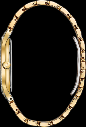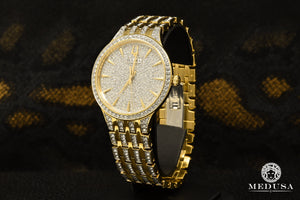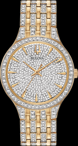 New slim and elegant style adorned with 636 Swarovski® crystals. Gold and silver-tone stainless steel case and bracelet with a transparent dial. The watch features a flat mineral crystal, a quartz movement, and water resistance up to 30 meters.