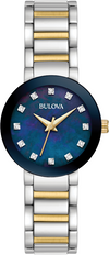 From the Futuro collection. In stainless steel and gold-tone, 12 diamonds, individually hand-set on a blue mother-of-pearl dial, a domed mineral glass, an edge-to-edge metallic crystal, a stainless steel and rose gold-tone bracelet with a deployment clasp.