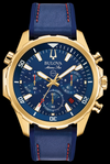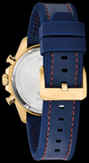 From the Marine Star collection. Six-hand chronograph with calendar in black IP and gold stainless steel with black dial, flat mineral glass, screw-down case, blue silicone strap with 3-piece buckle closure.
