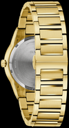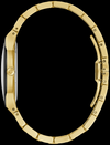 This chic men's watch from Bulova's Modern collection is a true masterpiece of modern design that will add a contemporary touch to your style. The gold-toned stainless steel case features a metallic domed sapphire crystal extending edge to edge to form the watch's black bezel, while its elegant silhouette blends seamlessly into a matching gold-toned stainless steel bracelet with brushed center links and a push-button deployment clasp for a sleek look. A gold-toned case ring surrounds the dramatic black dial, which pushes the boundaries of minimalism with matching angular hands and the absence of markers. A sign of unwavering commitment to modern design, this Bulova men's watch will make any outfit stand out.