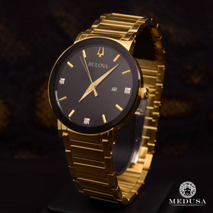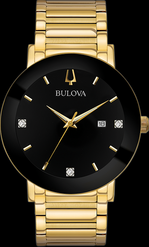 In black IP stainless steel and gold with three diamonds on a black dial, date with three hands, curved metallized edge-to-edge crystal, screw-down case, gold stainless steel bracelet with deployant clasp, and 30 meters water resistance.