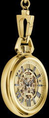 The new Bulova Sutton pocket watch lets you discover the foundations of American watchmaking, when American watchmakers like Joseph Bulova were at the forefront of timekeeping and pocket watches were the norm. The sophisticated polished gold-tone stainless steel case features a mineral crystal and a winding crown protected by a knot that adds a modern touch to this classic silhouette. The gold dial has silver Roman numerals and hands, with a central opening that offers a view of the watch's internal workings. The skeleton automatic movement powering the watch has 21 jewels and a 42-hour power reserve. The historic look is completed by a 15-inch gold-tone stainless steel chain ending in a tuning fork-shaped spring clip for secure attachment. A modern reinterpretation of an American classic, the Bulova Sutton pocket watch carries its owner with classic refinement. Caliber: 8N24