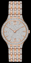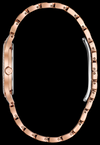 Nuevo vestido esbelto en acero inoxidable con baño de oro rosa realzado con cristales Swarovski © 178 en el brazalete, bisel y nácar blanco, hebilla desplegable y resistencia al agua hasta 30 metros.