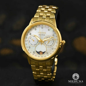 The latest Citizen women's Calendar watch combines aesthetic refinement and cutting-edge technology. The stainless steel case with gold tones highlights the white mother-of-pearl analog dial. This watch not only displays the time but also the month, day, date, and lunar phases. Nine sparkling diamonds beautifully adorn the dial for the ultimate elegance. The gold-tone stainless steel bracelet easily fastens with a deployant clasp. Equipped with Citizen's durable Eco-Drive technology, this watch is powered by light in all its forms. Perfectly combining presence and extraordinary precision, it will surely enhance your style