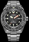 Dive into a new collection of automatic dive watches with a deep connection to Citizen's history of innovation and exclusive technology. The new Promaster Automatic Diver 200M watch features Citizen Super Titanium™ construction that is both lightweight and ultra-durable. The bezel has angled tabs for an easy grip, and the bezel and dial feature a pyramid stud design surrounding a double-domed anti-reflective sapphire crystal, with the black dial contrasting nicely with the titanium case and bracelet for a strong aesthetic of sport, style, and performance. Powered by the movement of your wrist, this advanced automatic watch has a 42-hour power reserve and large luminous hands and markers applied to provide easy reading in the dark or underwater. It comes in an exclusive collector’s tank box and meets ISO standards with a screw-down crown and water resistance up to 200 meters. Caliber 9051.