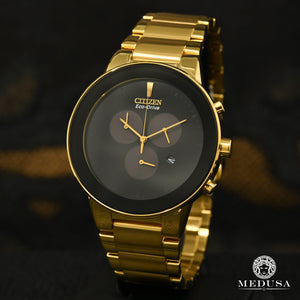El diseño refinado pero elegante de Axiom ofrece opciones de moda del día a la noche para apasionados creadores de tendencias. Este nítido cronógrafo se presenta en una caja y brazalete de acero inoxidable en tono dorado con una esfera negra y la intrigante característica del cristal de borde a borde. También cuenta con un cronógrafo de un segundo que mide hasta 60 minutos, hora de 12/24 horas y una ventana de fecha inversa.