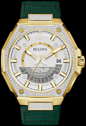 Defined by refinement and driven by innovation, this watch from the X series combines Bulova's most advanced technology with a truly luxurious design. The distinctive case design features a faceted gold-tone stainless steel construction, with a mix of polished and brushed finishes, a curved sapphire crystal with anti-reflective coating, as well as a bezel and bracelet adorned with 174 hand-set 1 mm diamonds totaling 0.83 ctw. The striking dial has a brushed silver finish with gold-tone hands and applied markers with luminous filling, a date window, and a seconds hand with a smooth sweep. A translucent opening in the dial offers a glimpse of Bulova's exclusive Precisionist movement, a revolutionary 8-jewel quartz mechanism accurate to 5 seconds per month and with increased resistance to temperature changes. The watch is water-resistant to 100 m and is paired with a bold dark green crocodile-grain leather strap with a push-button deployant clasp. An instant classic, this Bulova watch offers distinguished elegance in every setting.