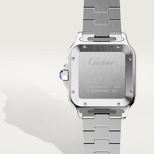 Reloj Santos, modelo grande, movimiento mecánico de carga automática 1847 MC. Caja de acero, corona de 7 lados adornada con una espinela sintética facetada, esfera opalina plateada, agujas en forma de espada de acero azulado, cristal de zafiro. Brazalete de acero con sistema de ajuste de tamaño "SmartLink". Segunda correa de piel de becerro, con hebilla desplegable de acero intercambiable. Ambas pulseras están equipadas con el sistema de intercambiabilidad "QuickSwitch". Ancho de la caja: 39,8 mm, grosor: 9,08 mm. Resistente al agua hasta 10 bares (~ 100 metros).