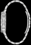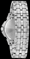 Caja y brazalete de acero inoxidable y esfera de pavé blanco plateado, adornada con 156 cristales de baguette llamativos. Cierre desplegable, cristal mineral plano, resistencia al agua hasta 30 metros.