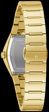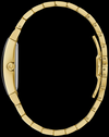 Distintiva caja asimétrica de acero inoxidable en tono dorado en forma de tonel con un cristal metálico curvado de borde a borde Futuro negro característico, una esfera negra con detalles en oro y un brazalete de acero inoxidable en tono dorado. El reloj tiene un movimiento de cuarzo de tres manecillas, un cierre desplegable con pulsadores y resistencia al agua hasta 30 metros.