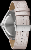Defined by refinement and driven by innovation, this watch from the X series combines Bulova's most advanced technology with a luxurious design. The bold case design features a silver-tone stainless steel construction with facets, a mix of polished and brushed finishes, a curved sapphire crystal with anti-reflective coating, as well as a bezel and bracelet adorned with 174 dazzling 1mm diamonds hand-set totaling 0.83 carats. The vibrant dial features a brushed silver finish with silver-tone hands and applied markers with luminous fill, a date window, and a seconds hand with a smooth sweep. A translucent opening in the dial offers a glimpse of Bulova's exclusive Precisionist movement, a revolutionary 8-jewel quartz mechanism accurate to 5 seconds per month and with enhanced resistance to temperature changes. The watch is water-resistant to 100m and is perfectly paired with a white crocodile-grain leather strap equipped with a push-button deployant clasp. Both elegant and versatile, this Bulova watch will be a favorite in any wardrobe.