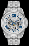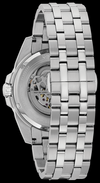 Diseño sofisticado con esfera completa y fondo de pantalla. Caja atornillada de acero inoxidable, esfera esqueletizada de tres agujas blanca y plateada que revela el intrincado funcionamiento del movimiento automático de 21 joyas, cristal mineral abovedado.
