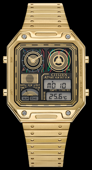 El nuevo reloj C-3PO™ con pantalla analógica-digital es un droide meticuloso de la galaxia Star Wars que conoce más de seis millones de formas de comunicación. Diseñado por el joven Anakin Skywalker™ y programado para adherirse a la etiqueta y el protocolo exigentes, la brillante personalidad de Threepio brilla en este reloj rectangular de acero inoxidable en tono dorado, inspirado en un modelo Citizen analógico y digital original de la década de 1980. El nuevo reloj es un Actualización del modelo analógico-digital anterior, esta vez con elegantes detalles de bisel, un brazalete cónico y una forma de 33,4 mm de ancho por 45,4 mm de largo. Este extraordinario reloj cuenta con dos subesferas analógicas para horas y minutos en un lado y segundos en el otro, con indicadores digitales adicionales para hora, día, fecha y temperatura. Con su pantalla analógica-digital y su diseño inspirado en droides, este reloj es un reloj único y extraordinario que le ayuda a capturar sus propios momentos galácticos y mágicos.