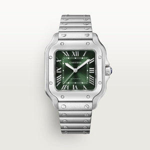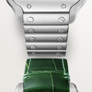 Montre Santos de Cartier, moyen modèle, mouvement mécanique à remontage automatique 1847 MC. Boîte en acier, couronne à 7 pans ornée d'un spinelle bleu de synthèse facetté, cadran vert dégradé , aiguilles en forme de glaive en acier poli et matière luminescente, glace saphir. Bracelet acier avec système de mise à taille « Smartlink ». Deuxième bracelet en alligator vert, avec boucle déployante interchangeable en acier. Les deux bracelets sont équipés du système d'interchangeabilité "QuickSwitch". Largeur de la boîte : 35,1 mm, épaisseur : 8,83 mm. Etanche jusqu'à 10 bars (~100 mètres).
