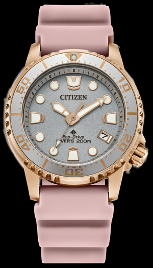 Plongez dans la dernière montre Dive pour rejoindre la gamme innovante Promaster de Citizen. La nouvelle montre présente un boîtier plus petit et polyvalent de 36,5 mm avec un extérieur en acier inoxydable de couleur or rose, une lunette de plongée facile à saisir et une couronne vissée à 4 heures, le design audacieux étant fixé au poignet via un bracelet en polyuréthane rose tendre. Le cadran blanc saisissant comporte des aiguilles surdimensionnées et des marqueurs appliqués qui ajoutent à sa haute lisibilité, tandis que des accents de teintes plus or rose et un matériau lumineux brillant assurent un style élégant et une lisibilité rapide, même dans les profondeurs les plus profondes. À la position 4 heures se trouve un guichet de date bien pensé, ajoutant un autre élément de fonctionnalité à ce plongeur polyvalent. Fidèle aux normes robustes de la collection Promaster, la montre est étanche jusqu'à 200 mètres. Alimenté par la technologie Eco-Drive exclusive de Citizen pour fournir une vitalité lumineuse de manière continue et durable sans jamais avoir besoin de batterie. Calibre E168.