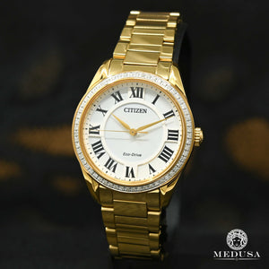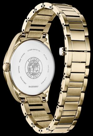 La montre Fiore de CITIZEN® allie une conception classique à une élégance sophistiquée. Modèle montré avec boîtier légèrement surdimensionné et bracelet en acier inoxydable aux teintes or, lunette sertie de 60 diamants et verre en saphir. Cette montre alimentée par la technologie Eco-Drive est dotée d’un cadran blanc décoré de chiffres romains noirs.
