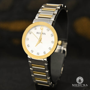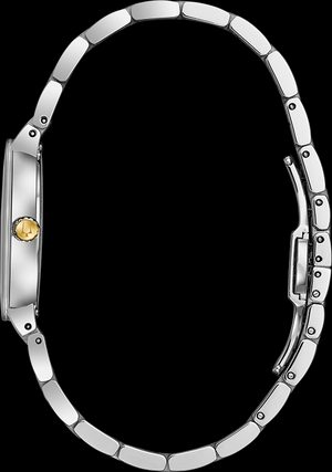 De la collection Futuro. En acier inoxydable avec accents dorés et 11 diamants, sertis individuellement à la main sur un cadran en nacre blanche, cristal minéral bombé métallisé bord à bord, boîtier à visser, bracelet en acier inoxydable accentué de tons dorés avec fermeture à déployant à double pression , et la résistance à l'eau à 30 mètres.