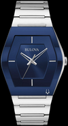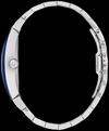 Boîtier en acier inoxydable de forme tonneau asymétrique distinctif avec une signature Futuro bleu bord à bord en cristal métallisé incurvé doté d'un cadran bleu et d'un bracelet en acier inoxydable. La montre dispose d'un mouvement à quartz à trois aiguilles, d'une boucle déployante avec poussoirs et d'une résistance à l'eau jusqu'à 30 mètres.
