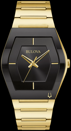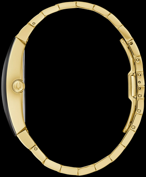 Boîtier en acier inoxydable doré de forme tonneau asymétrique distinctif avec un cristal métallisé incurvé bord à bord signature Futuro noir, un cadran noir avec des accents dorés et un bracelet en acier inoxydable doré. La montre dispose d'un mouvement à quartz à trois aiguilles, d'une boucle déployante avec poussoirs et d'une résistance à l'eau jusqu'à 30 mètres.