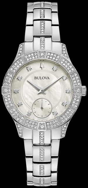 Boîtier, bracelet en acier inoxydable et cadran en nacre chocolat lustrée ornés de 174 cristaux Swarovski® brillants. Comprend un mouvement à quartz à sous-balayage à trois aiguilles, un cristal minéral plat et une résistance à l'eau jusqu'à 30 mètres.