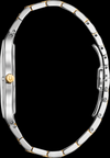 Boîtier en acier inoxydable ton argent avec couronne en cristal métallisé bombé bleu et ton doré. Cadran bleu avec quatre diamants affleurant sur le cristal.