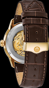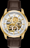 Design sophistiqué avec cadran et fond d'exposition complets. Boîtier à vis en acier inoxydable doré, cadran à trois aiguilles blanc squeletté et argent révélant les rouages complexes du mouvement à remontage automatique à 21 rubis, cristal minéral bombé, bracelet en cuir et résistance à l'eau à 30 mètres.